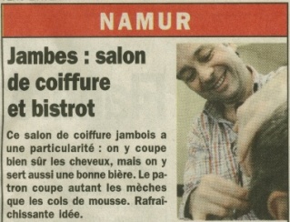 A Jambes, cela fera bientôt vingt ans qu'Olivier Heyman a fait entrer un comptoir dans son salon de coiffure. "Le loup dans la bergerie" diront certaines épouses acariâtres (je promets de ne plus les citer, mais que voulez-vous, c'est un salon "hommes"). Qu'à cela ne tienne, le comptoir a subi quelques retouches, s'est vu doté de nouveaux éviers, d'un zinc, de pompes à bière, le brasseur est passé... et les clients se sont adaptés, bon gré mal gré. |